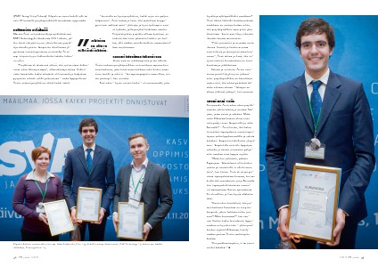 Kilpailun finalistit: vasemmalla toinen sija Mirka Korkia-Aho, Tieto Oyj, keskellä voittaja Marcos Arizti, BMH Technology Oy, kolmas sija Markku