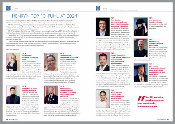 Vuoden 2024 Top 10 : een nousseiden puhujien asiantuntemuksen piiriin kuuluivat mm . juridiikka , mielenterveys , psykologinen turvallisuus ja jaksaminen . HENRY pyrkii jatkuvasti laajentamaan asiantuntijapiiriään tarjoten jäsenilleen mahdollisuuden verkostoitua ja oppia uutta .