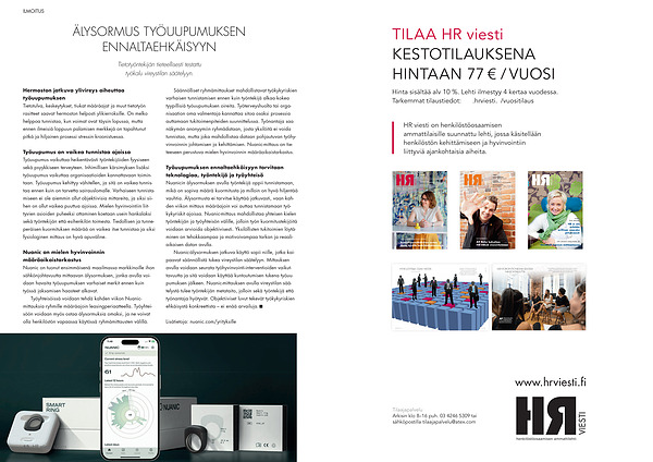 Työuupumuksen ennaltaehkäisyyn tarvitaan teknologiaa , työntekijä ja työyhteisö Nuanicin älysormuksen avulla työntekijä oppii tunnistamaan , mikä on sopiva määrä kuormitusta ja milloin on hyvä hiljentää vauhtia . Älysormusta ei tarvitse käyttää jatkuvasti , vaan kahden viikon mittaus määräajoin voi auttaa tunnistamaan työkykyriskit ajoissa . Nuanic-mittaus mahdollistaa yhteisen kielen työntekijän ja työyhteisön välille , jolloin työn kuormitustekijöitä voidaan arvioida objektiivisesti . Yksilöllisten tukitoimien löytäminen on tehokkaampaa ja motivoivampaa tarkan ja reaaliaikaisen datan avulla .