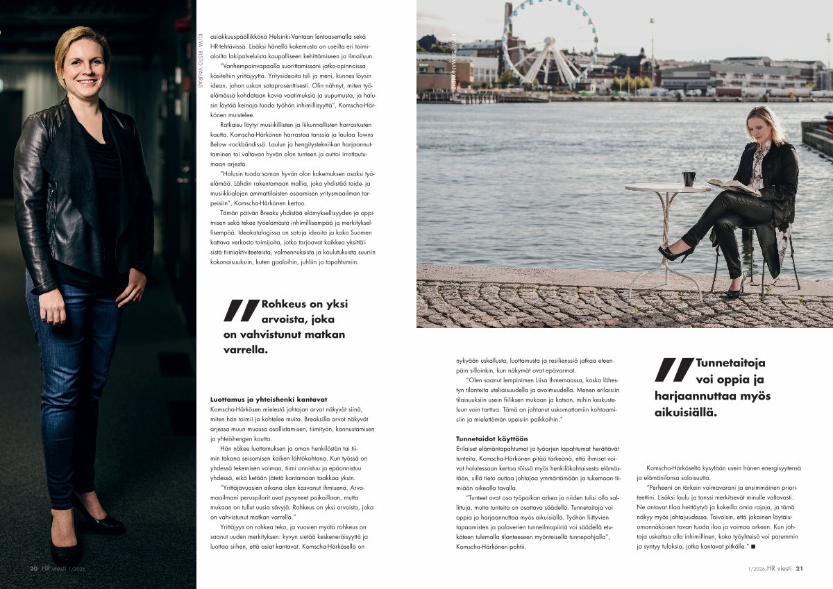 KUVA: RISTO VAURAS asiakkuuspäällikkönä Helsinki-Vantaan lentoasemalla sekä HR-tehtävissä. Lisäksi hänellä kokemusta on useilta eri toimialoilta lakipalveluista kaupalliseen kehittämiseen ja ilmailuun.” Vanhempainvapaalla suorittamissani jatko-opinnoissa käsiteltiin yrittäjyyttä. Yritysideoita tuli ja meni, kunnes löysin idean, johon uskon sataprosenttisesti. Olin nähnyt, miten työelämässä kohdataan kovia vaatimuksia ja uupumusta, ja halusin löytää keinoja tuoda työhön inhimillisyyttä”, Komscha-Härkönen muistelee.