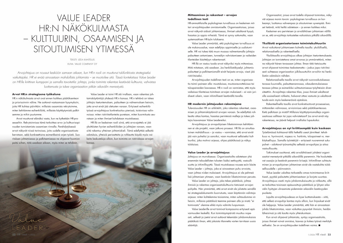 Lopulta arvojohtajuudessa on kyse luottamuksesta – siitä, että selkeä arvopohja kantaa myös silloin, kun linjaukset eivät ole helppoja. Value Leader ymmärtää, että hän ei ainoastaan johda liiketoimintaa, vaan vaikuttaa pysyvästi ihmisiin, heidän läheisiinsä ja sitä kautta myös yhteiskuntaan.