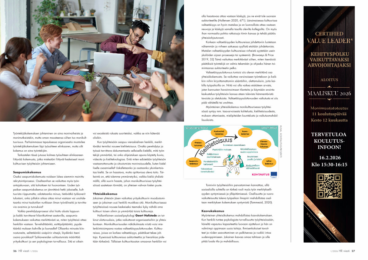 Myönteinen yhteisökokemus monikulttuurisessa työyhteisössä syntyy mm. tasa-arvoisesta kohtelusta, kielitietoisuudesta, mukaan ottamisesta, mielipiteiden kuuntelusta ja vaikutusmahdollisuuksista.