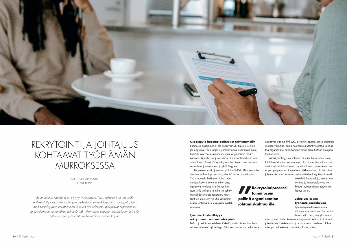 antajaa kokonaisuutena: miten organisaatiota johdetaan, millainen kulttuuri siellä vallitsee ja millaisia kehittymismahdollisuuksia tarjotaan. Rekrytointi on siten siirtynyt yhä selvemmin osaksi johtamista ja strategista päätöksentekoa.
