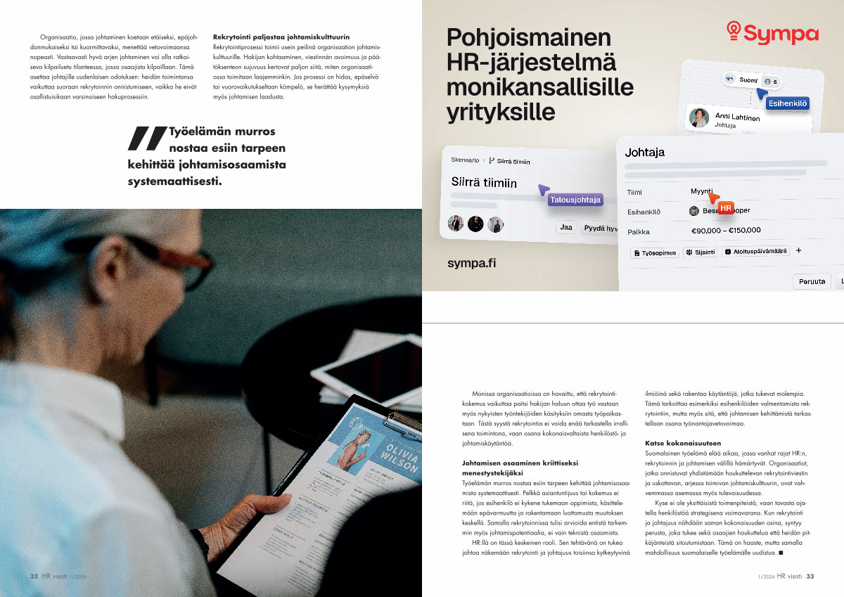 Katse kokonaisuuteen Suomalainen työelämä elää aikaa, jossa vanhat rajat HR: n, rekrytoinnin ja johtamisen välillä hämärtyvät. Organisaatiot, jotka onnistuvat yhdistämään houkuttelevan rekrytointiviestin ja uskottavan, arjessa toimivan johtamiskulttuurin, ovat vahvemmassa asemassa myös tulevaisuudessa.