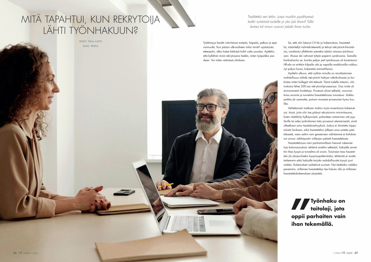 Työttömyys herätti ristiriitaisia tunteita, häpeää, pelkoa ja epävarmuutta. Kun pääsin alkuvaiheen miksi minä?-ajatuksista eteenpäin, alkoi katse kääntyä kohti uutta suuntaa. Ajattelin, että kyllähän minä rekrytoijana tiedän, miten työpaikka saadaan. Voi miten väärässä olinkaan.