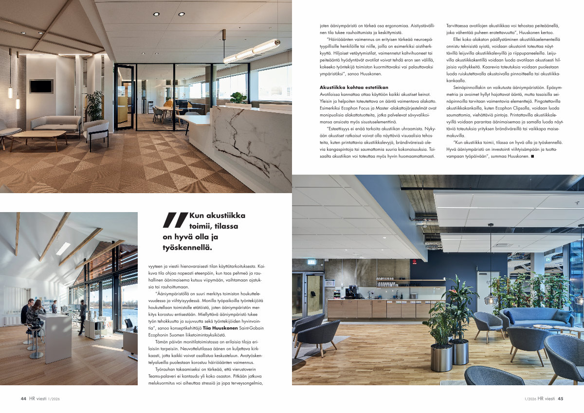 ” Ääniympäristöllä on suuri merkitys toimiston houkuttelevuudessa ja viihtyisyydessä. Monilla työpaikoilla työntekijöitä houkutellaan toimistolle etätöistä, joten ääniympäristön merkitys korostuu entisestään. Miellyttävä ääniympäristö tukee työn tehokkuutta ja sujuvuutta sekä työntekijöiden hyvinvointia”, sanoo konseptikehittäjä Tiia Huuskonen Saint-Gobain Ecophonin Suomen liiketoimintayksiköstä.