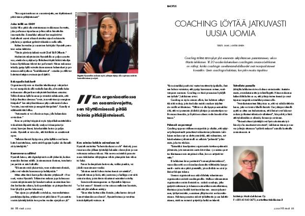 vampaan asemaan. Coaching on tässä prosessissa hyödylli- musta, avarakatseisuutta ja inhimillisyyttä. Hänen mukaansa