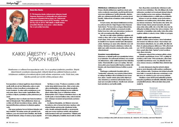 FT , YTM Marja-Liisa Manka , työhyvinvoinnin johtamisen dosentti Tampereen yliopistosta ja on työskennellyt myös työhyvinvoinnin professorina ja kirjoittanut lukuisia kirjoja , mm . Työhyvinvointi yhdessä Marjut Mankan kanssa ( 2016 ), Stressikirja – mistä virtaa ( 2015 ) ja Työn ilo ( 2013 ). Tällä hetkellä on tekeillä tietokirja työnimeltään Elämänilo : tunne juuresi – vaikuta elämääsi . Hän on myös pidetty luennoitsija .