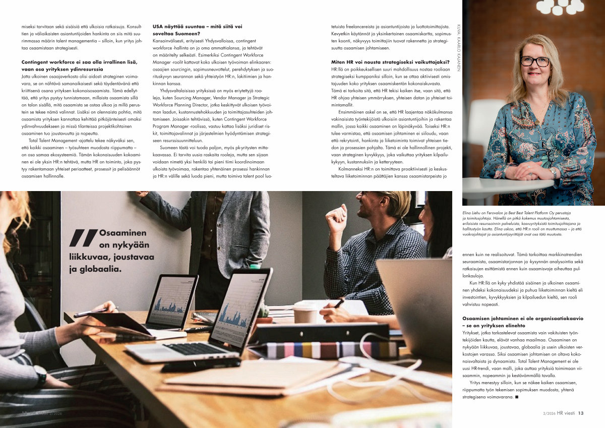 Ensimmäinen askel on se, että HR laajentaa näkökulmansa vakinaisista työntekijöistä ulkoisiin asiantuntijoihin ja rakentaa mallin, jossa kaikki osaaminen on läpinäkyvää. Toiseksi HR: n tulee varmistaa, että osaamisen johtaminen ei siiloudu, vaan että rekrytointi, hankinta ja liiketoiminta toimivat yhteisen tiedon ja prosessien pohjalta. Tämä ei ole hallinnollinen projekti, vaan strateginen kyvykkyys, joka vaikuttaa yrityksen kilpailukykyyn, kustannuksiin ja ketteryyteen.