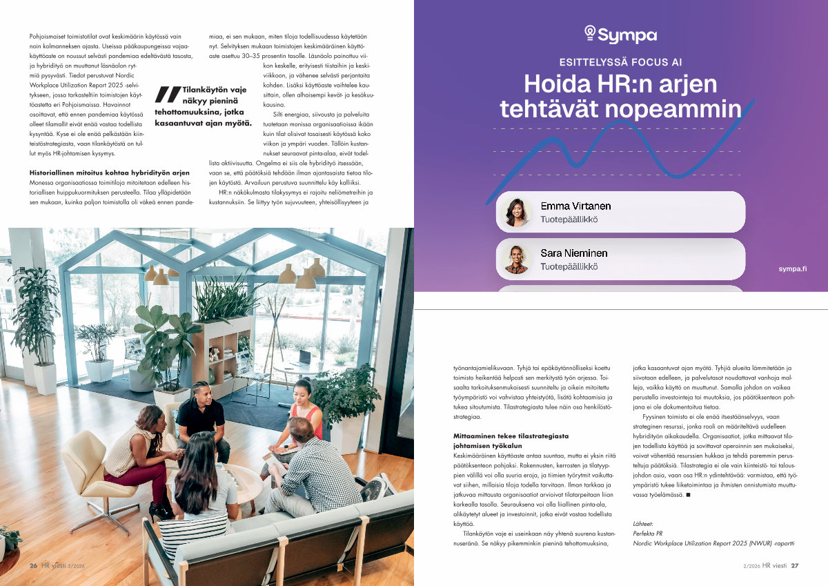 Workplace Utilization Report 2025-selvitykseen, jossa tarkasteltiin toimistojen käyttöastetta eri Pohjoismaissa. Havainnot osoittavat, että ennen pandemiaa käytössä olleet tilamallit eivät enää vastaa todellista kysyntää. Kyse ei ole enää pelkästään kiinteistöstrategiasta, vaan tilankäytöstä on tullut myös HR-johtamisen kysymys. |