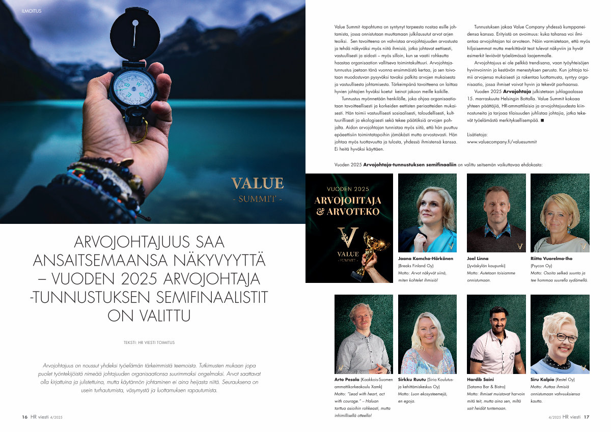 Vuoden 2025 Arvojohtaja julkistetaan juhlagaalassa 15. marraskuuta Helsingin Bottalla. Value Summit kokoaa yhteen päättäjiä, HR-ammattilaisia ja arvojohtajuudesta kiinnostuneita ja tarjoaa tilaisuuden juhlistaa johtajia, jotka tekevät työelämästä merkityksellisempää. n