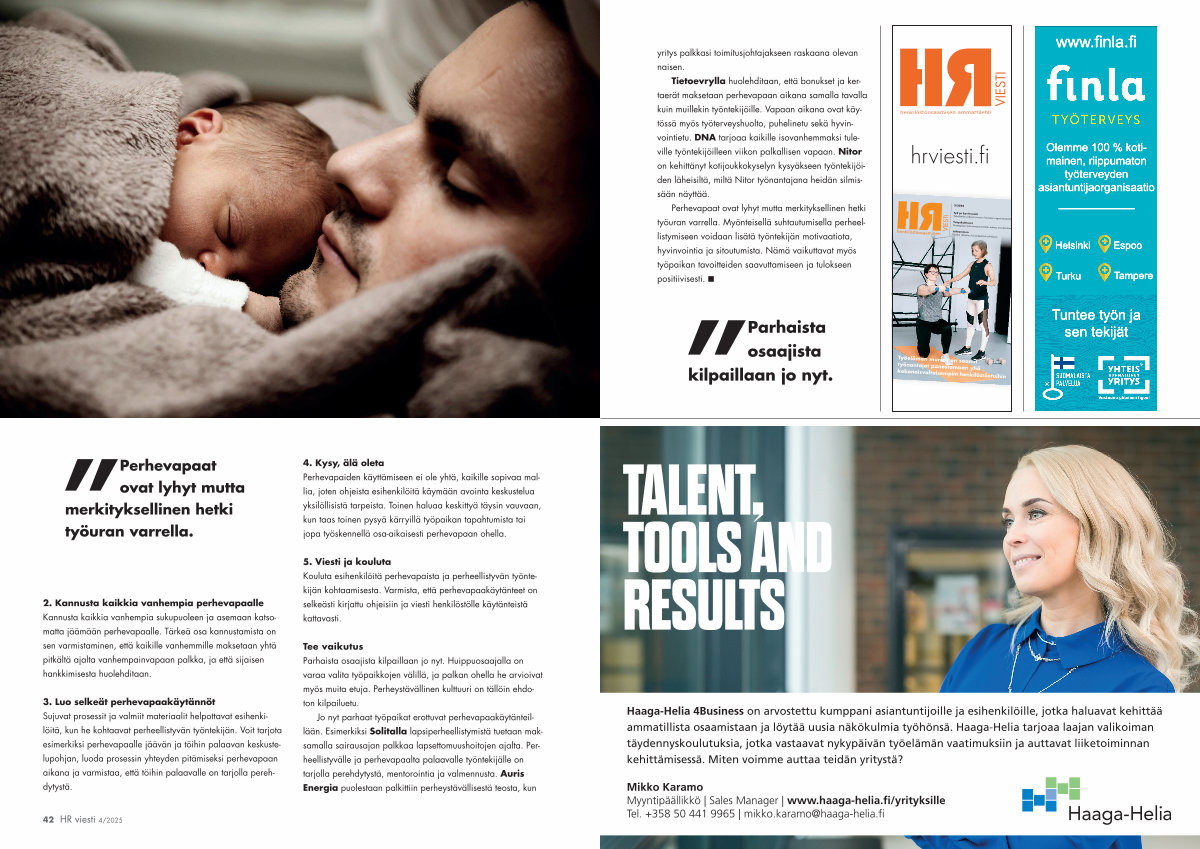 Jo nyt parhaat työpaikat erottuvat perhevapaakäytänteillään. Esimerkiksi Solitalla lapsiperheellistymistä tuetaan maksamalla sairausajan palkkaa lapsettomuushoitojen ajalta. Perheellistyvälle ja perhevapaalta palaavalle työntekijälle on tarjolla perehdytystä, mentorointia ja valmennusta. Auris Energia puolestaan palkittiin perheystävällisestä teosta, kun