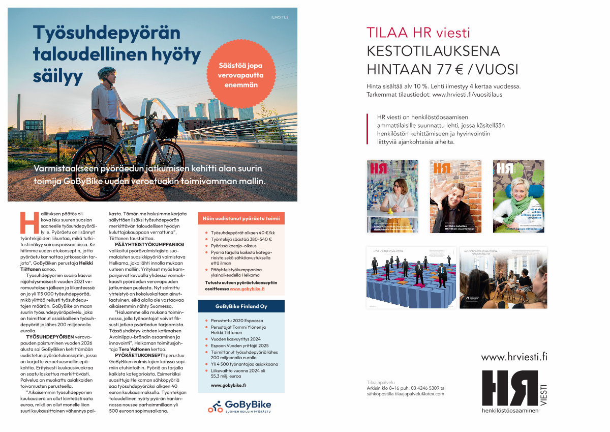 TYÖSUHDEPYÖRIEN verovapauden poistuminen vuoden 2026 alusta sai GoByBiken kehittämään uudistetun pyöräetukonseptin, jossa on korjattu veroetuusmallin epäkohtia. Erityisesti kuukausivuokraa on saatu laskettua merkittävästi. Palvelua on muokattu asiakkaiden toivomusten perusteella.