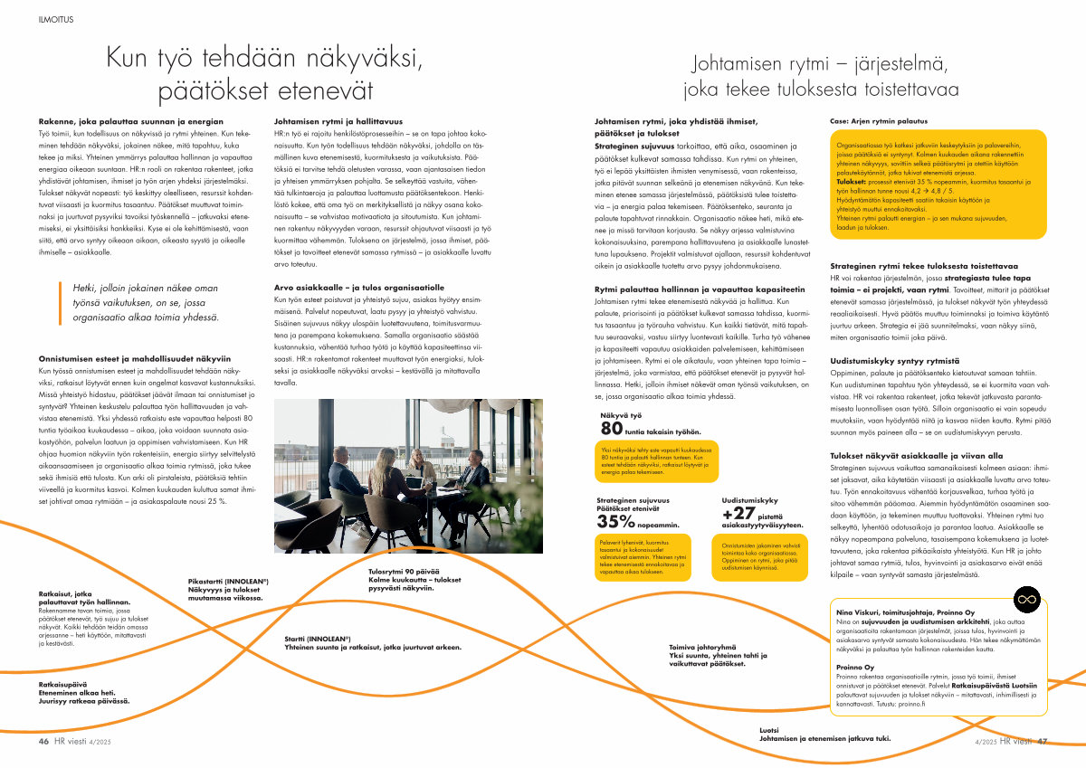 Rakenne, joka palauttaa suunnan ja energian Työ toimii, kun todellisuus on näkyvissä ja rytmi yhteinen. Kun tekeminen tehdään näkyväksi, jokainen näkee, mitä tapahtuu, kuka tekee ja miksi. Yhteinen ymmärrys palauttaa hallinnan ja vapauttaa energiaa oikeaan suuntaan. HR: n rooli on rakentaa rakenteet, jotka yhdistävät johtamisen, ihmiset ja työn arjen yhdeksi järjestelmäksi. Tulokset näkyvät nopeasti: työ keskittyy oleelliseen, resurssit kohdentuvat viisaasti ja kuormitus tasaantuu. Päätökset muuttuvat toiminnaksi ja juurtuvat pysyviksi tavoiksi työskennellä – jatkuvaksi etenemiseksi, ei yksittäisiksi hankkeiksi. Kyse ei ole kehittämisestä, vaan siitä, että arvo syntyy oikeaan aikaan, oikeasta syystä ja oikealle ihmiselle – asiakkaalle.